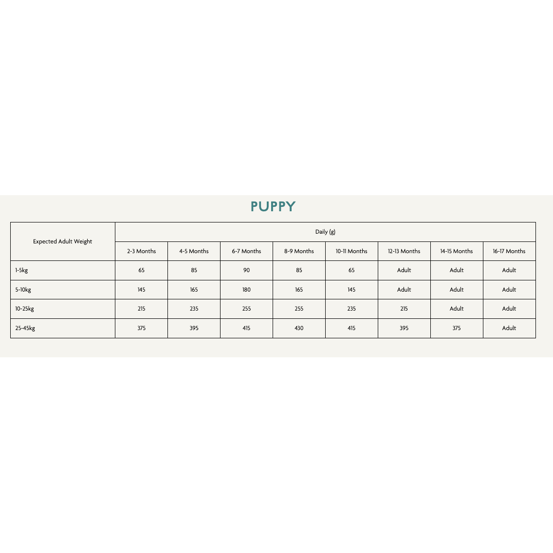 Grain free puppy food specially formulated with prebiotics for gut health, healthy omega-3 fatty acids, DHA for brain development and added joint care. Supports growing puppies from weaning to adulthood.