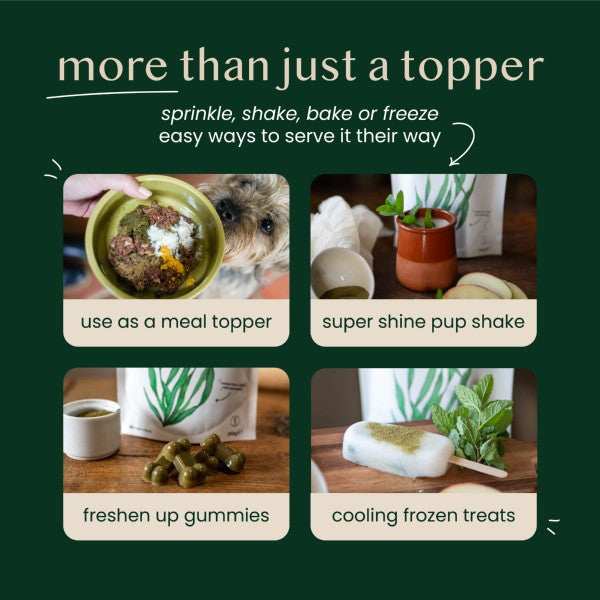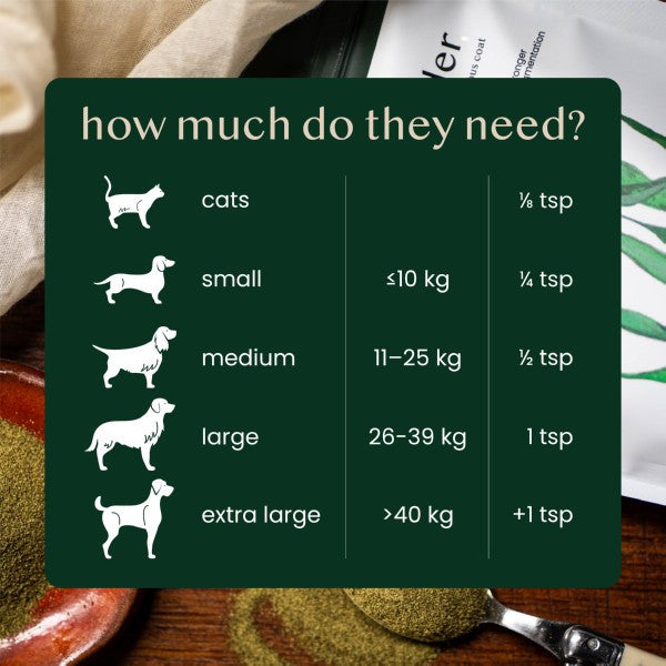 Fettle's Kelp Seaweed Powder is a natural, single-ingredient dental support topper made from 100% Scottish kelp. Sustainably hand-harvested from the pristine waters of Scotland’s Outer Hebrides and gently dried to preserve its marine minerals, it’s a clean and easy way to support everyday dental hygiene. Naturally rich in iodine, our coarse-ground kelp powder works through your pet’s saliva to help keep their mouth clean and breath fresh. Ideal as part of your pet’s daily routine - with no fillers, flavourings, or additives. Suitable for dogs and cats from 8 weeks of age.