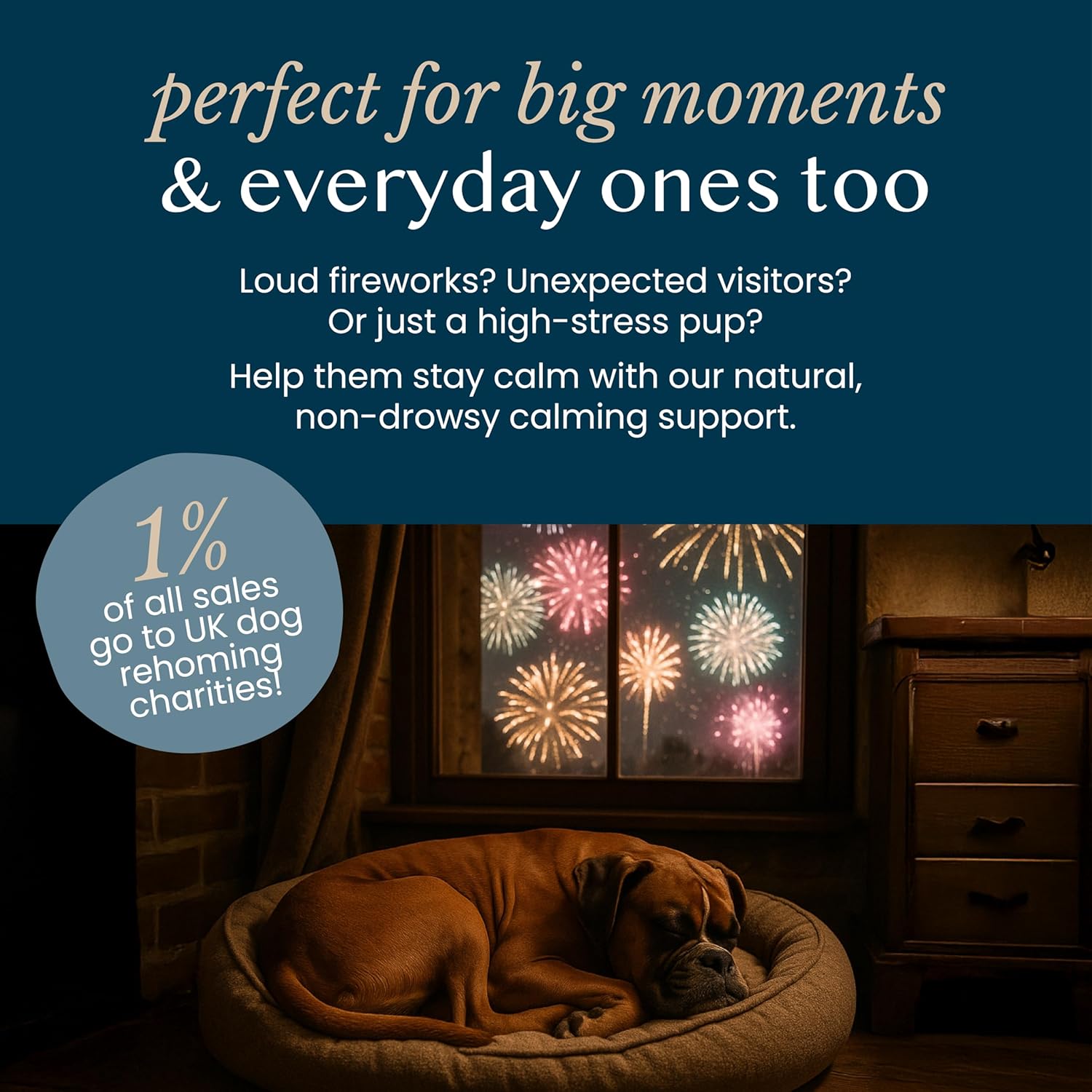 Whether they’re barking at every noise, pacing when you leave, or just struggling to switch off, this calming blend helps take the edge off. Ideal for daily use or stressful moments, it can be fed as part of their routine or a few days before fireworks, travel or visitors.