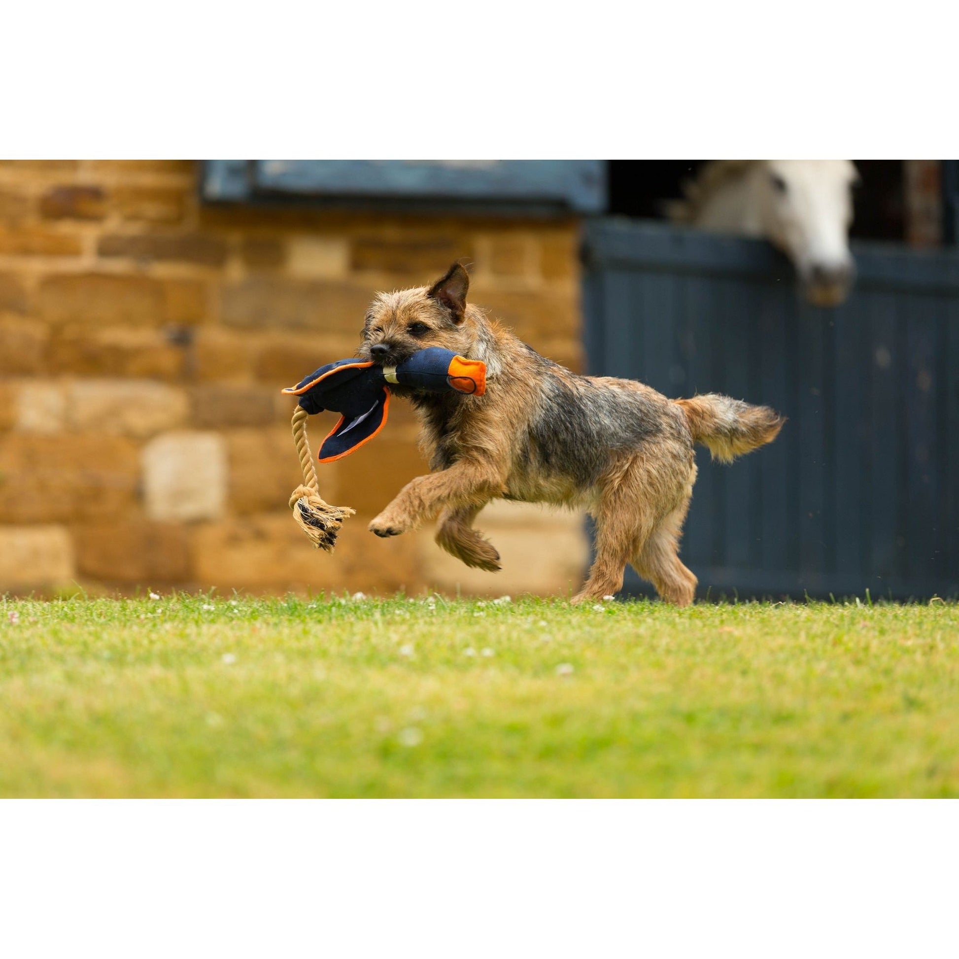 The House of Paws Navy Duck Canvas Thrower Dog Toy is perfect for active dogs who love to play fetch. Made with durable canvas and featuring a fun duck design, this toy is ideal for outdoor play. The rope tail adds an extra element of fun and the built-in plastic squeaker will keep your pet entertained. Available in two sizes, this toy is sure to provide hours of entertainment for your furry friend. And don't forget to supervise your pet during playtime to ensure their safety.