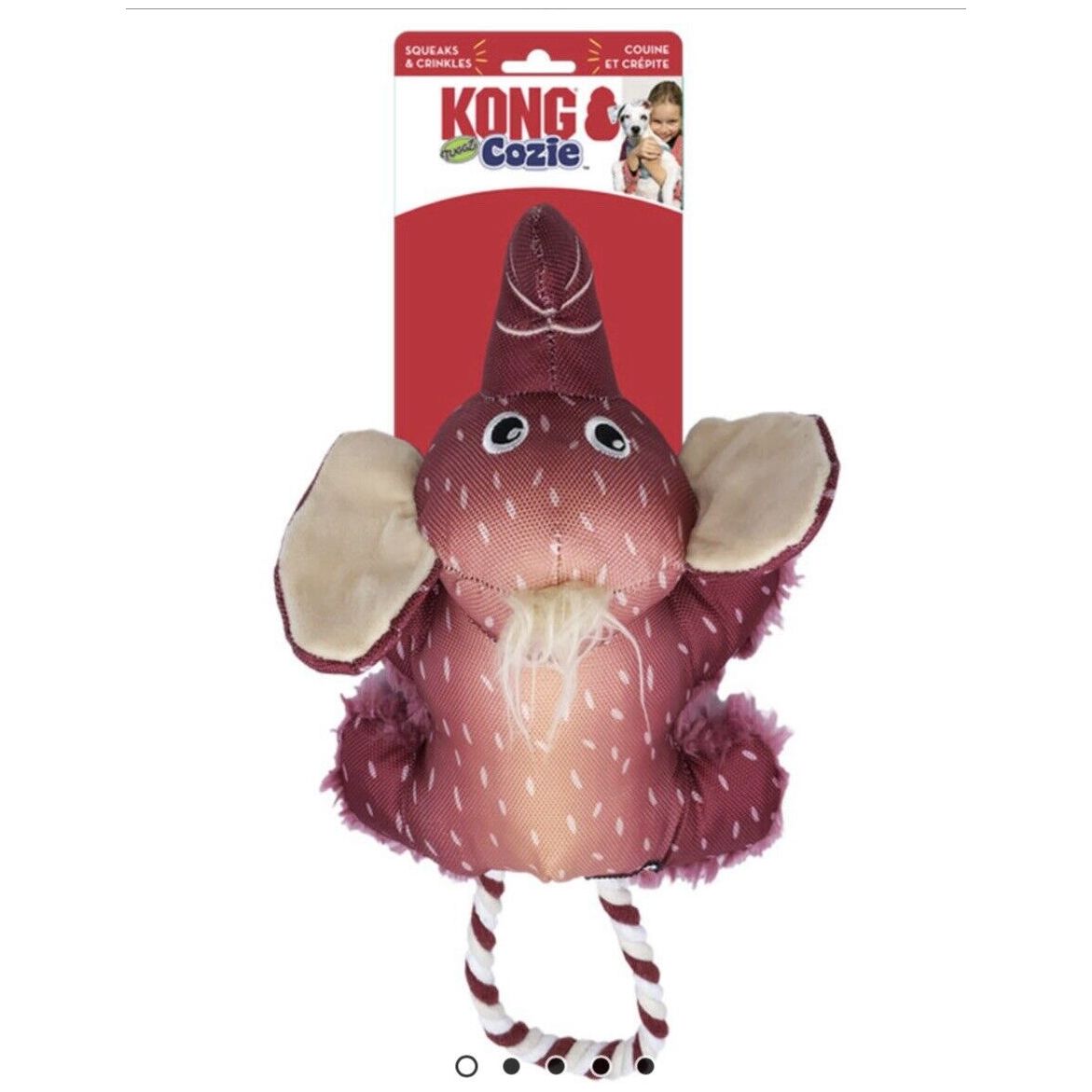 Cozie Tuggz Elephant’s rope handle is made from sturdy cotton rope knotted inside his body for instinct-satisfying tugging action. He squeaks and crinkles to keep the fun going for lots of healthy interactive play. This pint-sized pachyderm’s soft plush invites soothing snuggles between bouts of tug-of-war.